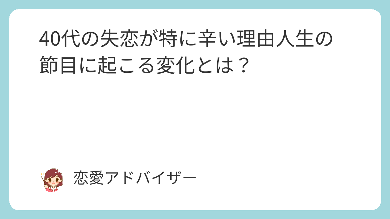 40代は、周囲の既婚者が増える時期でもあり、失恋すると「この先一人で生きていくのでは?」という不安が強まります。また、結婚を前提にしていた場合、その計画がなくなることで精神的なダメージが深くなります。 -